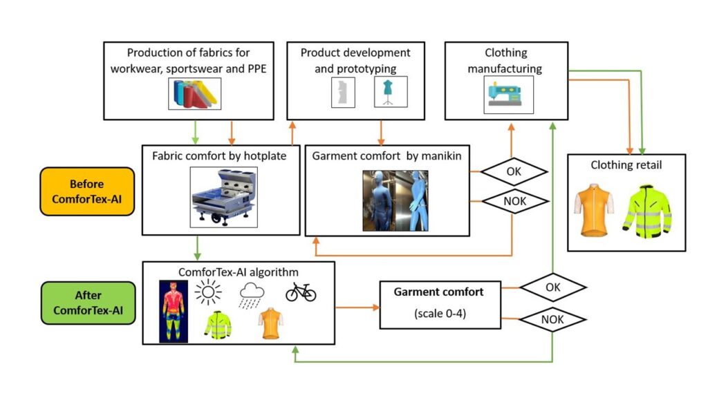 ComforTex-AI ist ein internationales Forschungsprojekt, das den Tragekomfort von Funktions- und Schutzbekleidung neu definiert. Durch den Einsatz modernster Technologien wie Infrarot-Thermografie, Deep Learning (DL), die Berücksichtigung der Stoffeigenschaften, die Umgebung (d. h. Lufttemperatur und -feuchtigkeit), die Arbeitsintensität und das Kleidungsdesigns entwickelt das Projekt eine innovative Methodik zur Vorhersage des Bekleidungskomforts um Bekleidung effizient zu konzipieren und zu entwickeln.