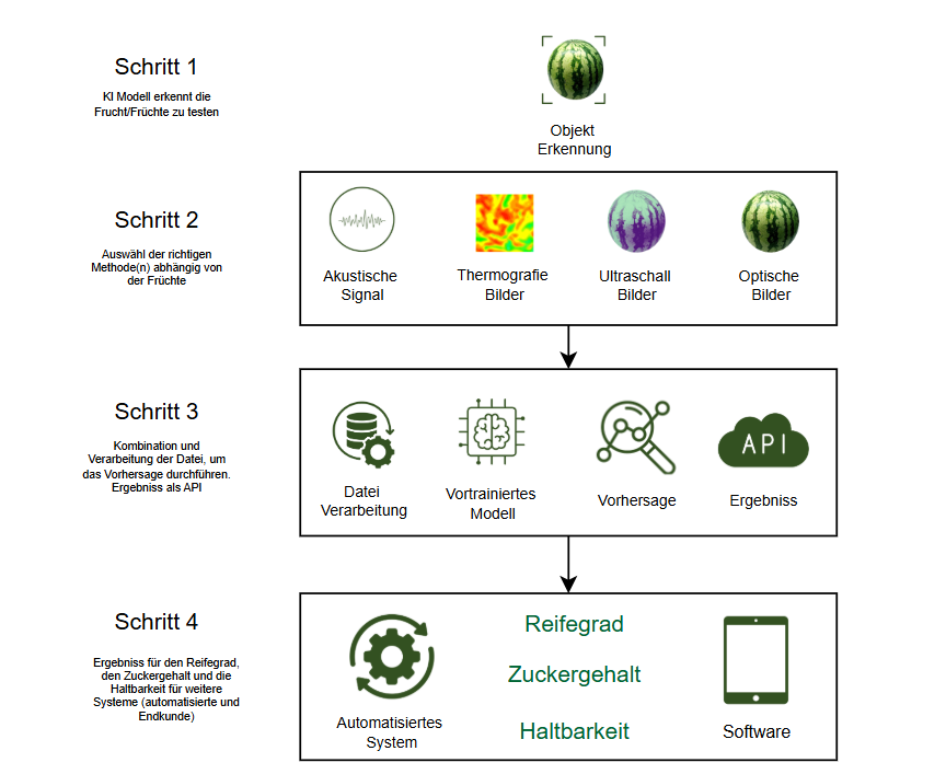 Das Herzstück von Fruitable ist eine Künstliche Intelligenz, die mithilfe umfangreicher Datensätze trainiert wurde. Durch intelligente Auswertung verschiedenster Sensordaten erkennt das System den inneren Zustand der Frucht, ohne sie zu öffnen. Die Forschung basiert auf Methoden des Deep Learning und aktiven Lernens. Das System funktioniert aktuell bei Melonen und Äpfeln.